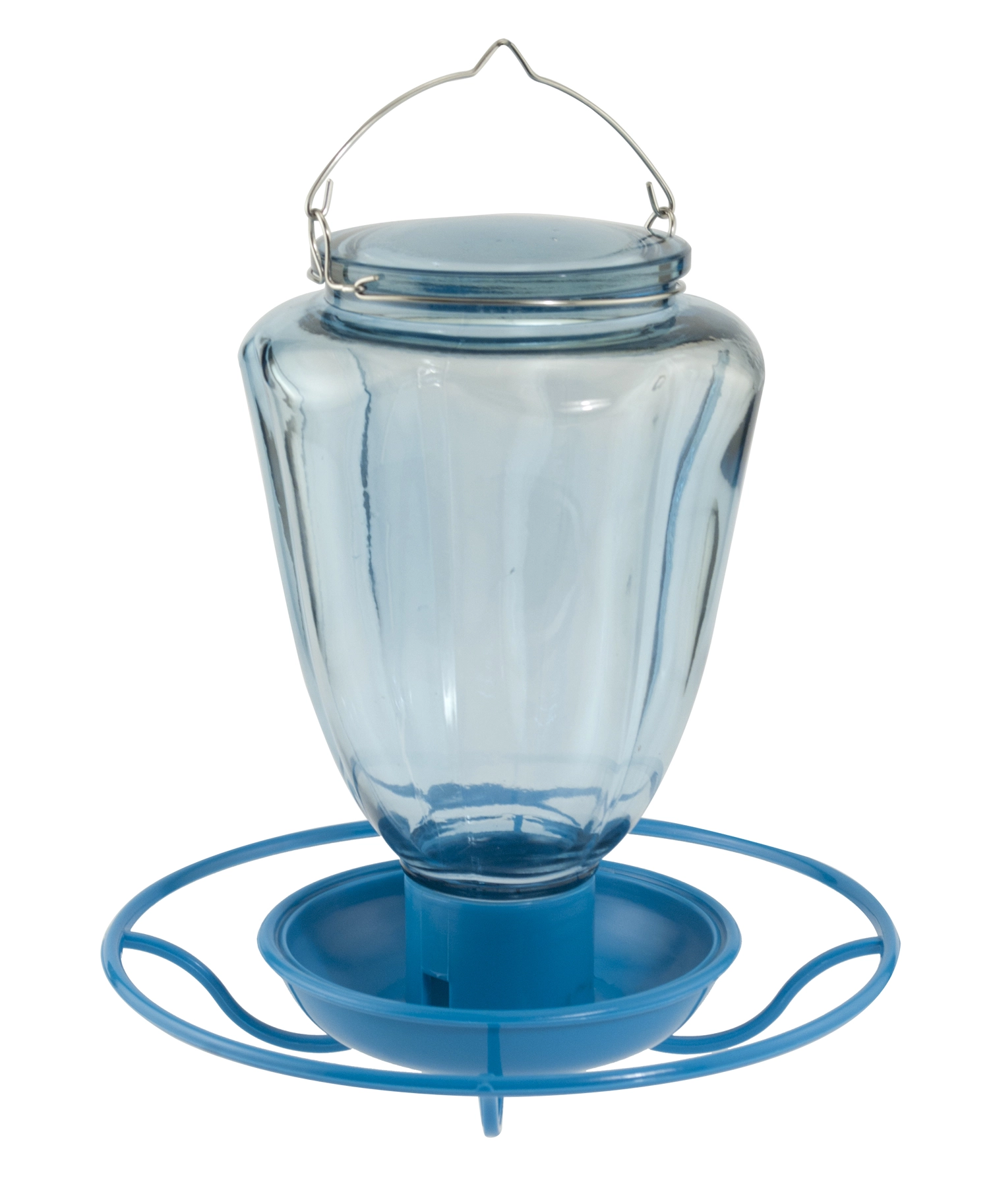 This decorative and durable hanging glass water drinker includes a built-in metal hanger with a blue tinted glass reservoir.