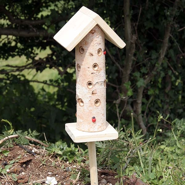 A natural habitat for ladybirds and other beneficial insects, the Ladybird Tower has a central chamber filled with natural material. There are many holes drilled at an upward angle for the insects to reach the insulated and safe inner chamber. If necessary the roof panel may be removed for inspection or cleaning.