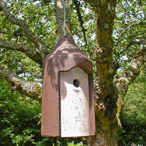 The free suspension with a central hanger and its conical roof makes it well protected against cats. It is very popular in private gardens and especially around fruit trees, mainly in areas where the trees are short and have many branches. This box is not designed to be installed directly at the tree trunk.