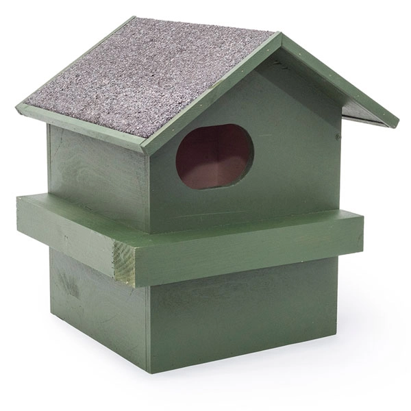 This plywood house has been designed with a wide hole so squirrels can take their young into the house easily and safely. The platform around the middle of the house allows easier access for squirrels, especially the juveniles who will use the platform to help them come and go from the house with ease.